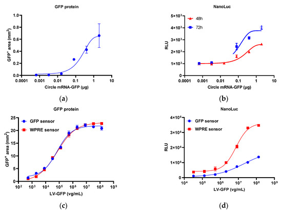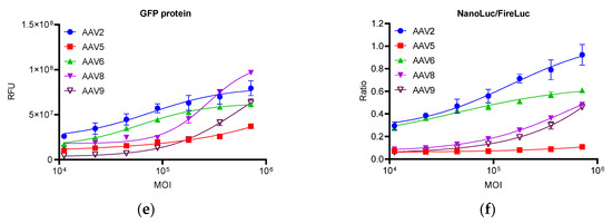 Dose–response relationship of circle mRNA, lentivirus, and different AAVs. (a) GFP protein expression of circle mRNA. (b) Nano-luciferase activity of circle mRNA. (c) GFP protein expression of lentivirus. (d) Nano-luciferase activity of lentivirus. (e) GFP protein expression of different AAVs. (f) Nano-luciferase activity of different AAVs. Each plot represents two replicates. FireLuc, firefly luciferase; NanoLuc, nano-luciferase.