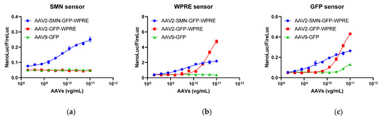To assess the specificity of the reporter assay, AAV samples harboring different elements were evaluated using SMN, GFP, and WPRE sensor reporter 293T cells. The SMN sensor demonstrated a dose-dependent response to AAV2-SMN-GFP-WPRE, whereas no response was elicited against AAV2-GFP-WPRE and AAV9-GFP (Figure 5a). Meanwhile, the WPRE sensor demonstrated a dose-dependent response to both AAV2-SMN-GFP-WPRE and AAV2-GFP-WPRE but not to AAV9-GFP (Figure 5b). Finally, the GFP sensor exhibited a dose-dependent response to all three AAVs (Figure 5c). AAV2-SMN-GFP-WPRE elicited similar dose–response patterns in the three sensor reporter cells. Likewise, AAV2-GFP-WPRE showed similar dose–response patterns in GFP and WPRE sensor reporter cells. Thus, the reporter assay was highly specific to its target sequence. In addition, sensors targeting different regions were consistent in their dose–response patterns for the same test sample.
