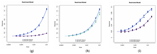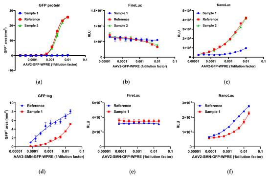 The AAV2-GFP-WPRE reference and two AAV2-GFP-WPRE samples (samples 1 and 2) were analyzed using GFP sensor reporter 293T cells. Figure 6a–c show the response of GFP expression, firefly luciferase, and nano-luciferase, respectively. High-titer AAVs resulted in reduced firefly luciferase activity, indicating their negative impact on cell function. To address this issue, the nano-luciferase-to-firefly luciferase ratio was employed as the response in a four-parameter logistic (4-PL) parallel analysis. Figure 6g,h illustrate the restricted 4-PL model employing the nano-luciferase-to-firefly luciferase ratio as the response and the 1/dilution factor as the dose. The AAV2-SMN-GFP-WPRE reference and sample 1 were analyzed using SMN sensor reporter 293T cells. Figure 6d–f show the response of GFP expression, firefly luciferase, and nano-luciferase, respectively. Figure 6i shows the restricted 4-PL model. According to the Chinese Pharmacopoeia, F-tests were performed to evaluate the data set for any notable nonlinearity or nonparallelism at the significance level of p = 0.05. The potency of the reference was set to 100%, and the relative potency of the test samples was calculated through comparison with the reference using 4-PL parallel analysis.