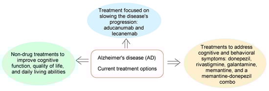As of now, eight drugs are commonly used to treat Alzheimer’s disease (Figure 1) [11]. These medications fall into three categories: cholinesterase inhibitors, NMDA receptor antagonists, and those targeting and removing beta-amyloid plaques. Additionally, they are classified as (a) medications for mild-to-moderate Alzheimer’s disease; (b) medications for moderate-to-severe Alzheimer’s disease; and (c) medications to be used with caution in people with Alzheimer’s disease.