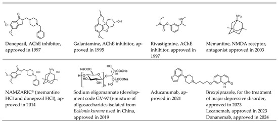 - Yajing, M.; Sufang, L.; Qingfeng, Z.; Zhonghua, L.; Zhang, Z.; Bin, Y. Approved drugs and natural products at clinical stages for treating Alzheimer’s disease. Chin. J. Nat. Med. 2024, 22, 699–710. [Google Scholar]