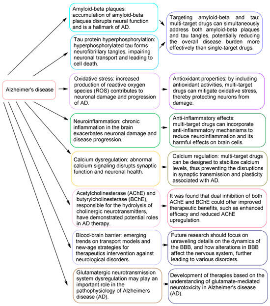 The complexity of AD’s molecular pathogenesis necessitates a multifaceted treatment approach. Multi-target drug design aligns well with this need, as it allows for simultaneous intervention in various disease mechanisms, offering a potentially more effective and comprehensive therapeutic strategy.