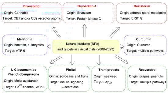 Two notable examples effective in managing Alzheimer’s symptoms are huperzine A and galantamine, derived from natural sources. Beyond these, many other natural products (NPs) show potential for AD treatment by acting through antioxidant, anti-inflammatory, and neuroprotective mechanisms. While extensive reviews exist on NPs in AD treatment, this section will focus on NPs currently in clinical trials, with key clinical information summarized in Figure 5 [115].