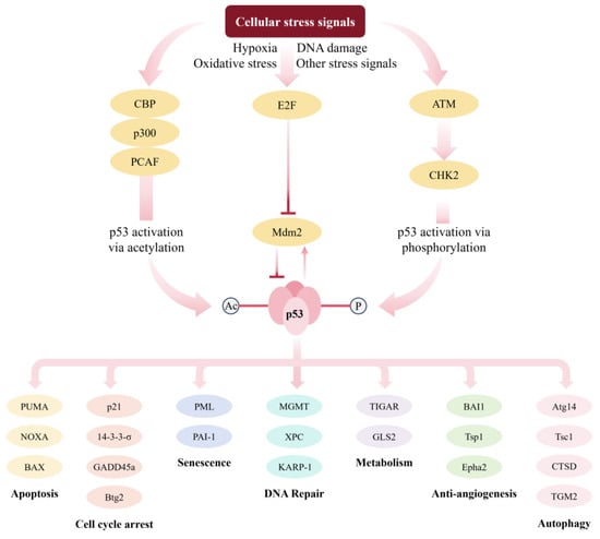 The activation and regulation of p53. Mdm2 can directly bind to p53, inhibiting its transcriptional activity. This interaction leads to the ubiquitination and proteasomal degradation of p53 as well as its export from the nucleus. The overactivity of Mdm2 may reduce the efficiency of p53 translated from a transfected vector. When cells are exposed to various stress signals, such as hypoxia, oxidative stress, or DNA damage, the pathways for p53 acetylation or phosphorylation are activated. This inhibits Mdm2-mediated ubiquitination and degradation of p53, promoting its stability and accumulation. Under pressure signals, E2F1 inhibits the expression of Mdm2, a ubiquitin ligase that promotes the degradation of p53. p300/CBP and related protein PCAF can bind and acetylate p53. The ATM activates its kinase activity, followed by phosphorylation and activation of CHEK2, which further phosphorylates the p53 protein. The phosphorylation and acetylation of p53 can inhibit its ubiquitin degradation and promote the stability and accumulation of p53. Then, p53 triggers cell apoptosis, cell cycle arrest, cell senescence, DNA repair, metabolic regulation, anti-tumor angiogenesis, and autophagy by regulating various downstream target genes or interactions with other proteins.