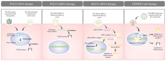 The fundamental tenets of p53-based gene therapy primarily involve elevating WTp53 levels in cancerous cells and diminishing MTp53 amounts in these cells. Presently, the established therapeutic approaches include WTp53 DNA replacement therapy, WTp53 mRNA replacement therapy, and small interfering RNA (siRNA) therapy directed towards MTp53, along with others (illustrated in Figure 2). Notably, WTp53 DNA replacement therapy has been extensively and thoroughly researched, whereas most other therapies are still in the nascent stages of exploration and have yet to be translated into clinical practice.