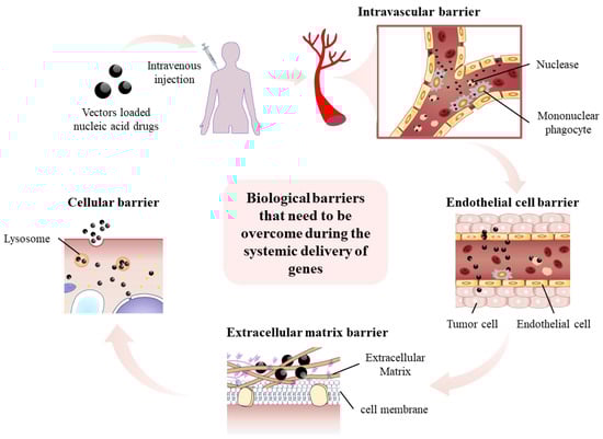 In p53-based gene therapy, it is vital to precisely transport the nucleic acid intended for treatment to either the nucleus or cytoplasm in cancer cells. Nonetheless, when delivering nucleic acids, numerous biological obstacles arise, making the employment of gene delivery vectors unavoidable. Gene vectors can assist nucleic acid in overcoming biological barriers in the human body, such as nucleases in serum, mononuclear phagocytic cell system, endothelial cells, extracellular matrix, cell membrane, lysosomes, etc., making nucleic acid more effectively delivered to a target location (illustrated in Figure 3). Gene vectors are mainly divided into two categories: viral vectors and non-viral vectors. Next, we will introduce and discuss the p53-based gene therapy mediated by these vectors.