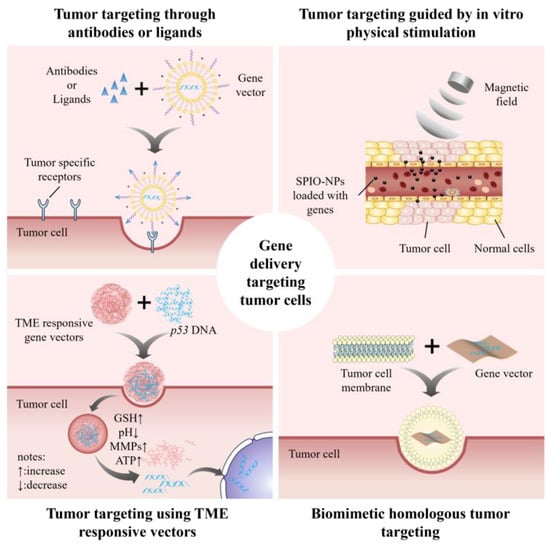 Tumor targeting using TME-responsive vectors are described as follows: Compared with normal tissue, the TME has characteristics such as relative hypoxia, high H2O2 content, high GSH concentration, low pH, an overexpression of tumor-related enzymes, and high levels of ATP [168]. Therefore, TME-sensitive chemical bonds or macromolecules were introduced into vectors to construct TME-responsive delivery systems that can specifically release drugs in tumor cells. Some typical TME-responsive vectors in p53 gene therapy are shown in Table 2.