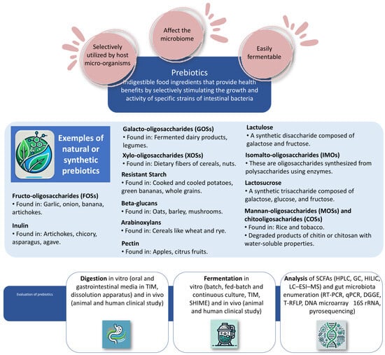 Prebiotics are indigestible food ingredients that provide health benefits by selectively stimulating the growth and activity of specific strains of intestinal bacteria, mainly from the Bifidobacterium and Lactobacillus genera []. The term “prebiotic” was first introduced by Gibson and Roberfroid in 1995. They defined prebiotics as “non-digestible food ingredients that beneficially affect the host by selectively stimulating the growth and/or activity of one or a limited number of bacteria in the colon, and thus improve host health.” []. Following the initial definition, further research refined the understanding of prebiotics. Scientists focused on identifying specific dietary fibers and non-digestible carbohydrates that met these criteria, such as inulin, fructo-oligosaccharides (FOSs), and galacto-oligosaccharides (GOSs). In 2017, ISAPP (International Scientific Association of Probiotics and Prebiotics) provided a more comprehensive definition: “A prebiotic is a substrate that is selectively utilized by host microorganisms conferring a health benefit.” []. This definition emphasizes the selectivity and health benefits conferred by prebiotics and is broad enough to include non-carbohydrate substances and effects beyond the gut microbiota. Today, the understanding of prebiotics includes not only dietary fibers but also other compounds such as polyphenols and fatty acids that can selectively stimulate beneficial microbes []. The focus is on the specific health benefits that these compounds can provide to the host, including but not limited to improved digestion, enhanced immune function, and reduced inflammation. A compound is classified as a prebiotic based on the following criteria: it must withstand the acidic conditions of the stomach, remain unaffected by mammalian enzymes, such as amylase, protease, lipase, pancreatic enzymes, and brush border enzymes (e.g., maltase, sucrase, lactase), and not be absorbed in the gastrointestinal tract. Additionally, it should be fermentable by intestinal microbiota and selectively stimulate the growth and/or activity of intestinal bacteria in a way that enhances the host’s health []. Examples and properties of prebiotics are shown in Figure 1.