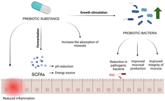 Unlike probiotics, which are live micro-organisms, prebiotics are substances that promote the growth of these beneficial bacteria. Their most important feature is that they are indigestible in the upper gastrointestinal tract, allowing them to reach the large intestine unchanged, where they can be fermented by the intestinal microflora []. Prebiotics exert their beneficial effects on health through several mechanisms. The main mechanism of action of prebiotics is to provide nutritional substrates for beneficial gut bacteria, especially Bifidobacteria and Lactobacilli. These bacteria ferment prebiotics, leading to the production of short-chain fatty acids (SCFAs) []. SCFAs, such as butyric acid, acetic acid, and propionic acid, are crucial for intestinal health. They act as an energy source for colon epithelial cells and reduce pH, which promotes the growth of beneficial bacteria and inhibits the growth of pathogens. Butyrate also exhibits anti-inflammatory effects by inhibiting the pro-inflammatory cytokines interferon gamma (IFN-γ) and interleukin 2 (IL-2) through inhibition of nuclear factor kappa B (NF-κB) []. Probiotic bacteria in the gut, whose growth is stimulated by probiotic or/and prebiotic supplementation, or an appropriate diet, can support intestinal barrier function by stimulating mucus production and contributing to the integrity of the intestinal mucosa []. In addition, they can increase the absorption of minerals such as calcium and magnesium and improve lipid metabolism []. Regular intake of prebiotics can also reduce the risk of intestinal infections and inflammation, resulting in an overall improvement in gastrointestinal health []. The mechanism of action of prebiotics is graphically presented in Figure 2.