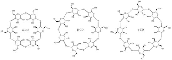 Cyclodextrins have found widespread use in pharmaceuticals due to their ability to form complexes with a variety of active substances. They are often used in drug formulation to improve the solubility of poorly water-soluble substances, which can lead to an increase in their bioavailability and therapeutic efficacy. In addition, cyclodextrins can be used to mask unpleasant tastes and odors, which can increase the acceptability of drugs to patients [,]. The resistance to digestion of cyclodextrins has been studied in various contexts, such as in the presence of prebiotics, where α-cyclodextrins were found to be non-digestible prebiotic carbohydrates supporting beneficial intestinal microflora in the colon. Their digestion depends on the type of cyclodextrin and the presence of specific enzymes in the digestive tract. The structures of main cyclodextrins are presented in Figure 3.