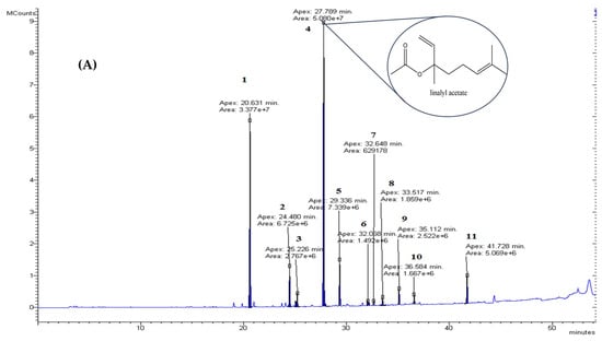 GC–MS chromatograms of the essential oils: (A): lavender (Lavandula angustifolia) essential oil; (B): Mentha (Mentha arvensis) essential oil.