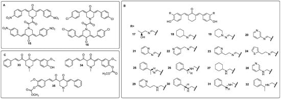 Chemical structures of curcumin derivatives: 15–16 (A), 17–32 (B), 33–35 (C).