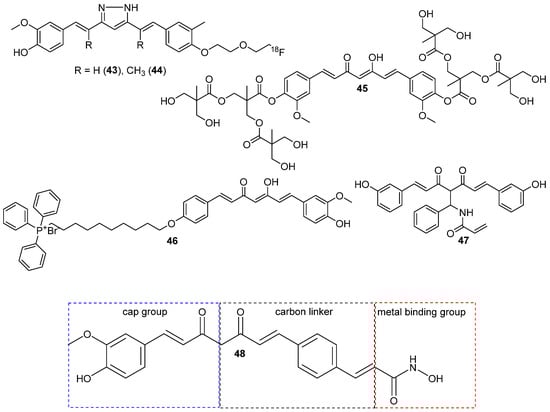 Based on the structure of the currently approved histone deacetylase (HADAC) and molecular modeling, Wang et al. [55] modified one of the aromatic rings to increase curcumin inhibitory potential toward HADAC. The methoxy group was removed, and the hydroxyl group was changed to N-hydroxyacrylamide [55]. Following molecular modeling, the novel compound consists of three major regions (Figure 7): (i) the cap group is exposed to the solvent space and interacts with the rim of the catalytic tunnel; (ii) the metal binding group occupies the catalytic site, and (iii) the carbon linker connects the two parts and interacts with phenylalanine through π–π stacking. Compound 48 revealed greater inhibition potential in vitro against some isoforms of HADAC, but it was a bit lower compared to vorinostat, an FDA-accepted HADAC inhibitor. The IC50 value was lower for 48 compared to curcumin and higher compared to vorinostat. The derivative was more resistant to metabolism, as the stability was five times higher in human liver microsomes than in curcumin. The in vivo study on mice showed the T1/2 of 3.2 h after oral dosing, with a bioavailability of 40.2%. Blood-brain barrier permeability was low but acceptable, with brain-to-plasma ratios of 0.08–0.23. It was also established that 48 caused cell apoptosis and cell cycle arrest in phase G2/M. In vivo comparison to vorinostat in mice with subcutaneously inoculated U87 cell line cells revealed no observable toxicity for either of them, yet 48 inhibited the tumor growth twice as much [55].