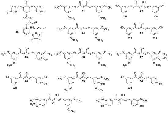 Zhang et al. [69] synthesized two series of curcumin derivatives in order to develop a potent chymotrypsin-like subunit of 20S proteasome, which is one of the regulators of basic cellular processes and pathways, including cell cycle, apoptosis, or DNA repair. All the obtained derivatives showed inhibition of the HCT116 (human colorectal carcinoma) cell line. Among them, 60 (Figure 10) showed excellent inhibition of the chymotrypsin-like activity of the 20S proteasome (IC50 = 0.835 µM), with simultaneously only a negligible effect on the other subunits—trypsin-like and peptidylglutamyl-peptide hydrolyzing [69].