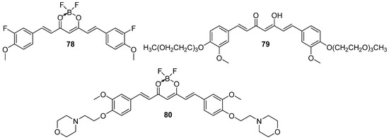 A slightly different approach (which was successful for breast cancer) for curcumin derivatization was reported by Shin et al. [52]. The two novel compounds were equipped with a conjugated ring in the alkyl region between the rings and side chain with 18F. Positron emission tomography imaging of C6 glioma xenografted mice indicated the highest uptake in tumor tissue for 44, but both tumor-to-blood or to-muscle ratios of 43 and 44 were nearly the same (Figure 7) [52].