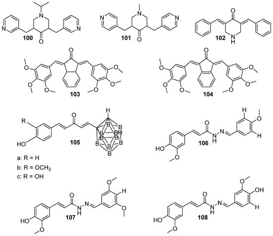 An interesting effect of curcumin and its cyclohexanone analogs was discovered accidentally by Revalde et al. [63]. During optimization of the liposomal formulation of gemcitabine with curcumin, the authors found that the interaction of these two compounds was antagonistic. Further evaluation on MIA PaCa-2 and PANC-1 cells showed that the curcuminoids inhibited equilibrative nucleoside transporter 1 at concentrations between 2–20 μM and blocked the accumulation of gemcitabine and uridine. The authors concluded that curcumin is unlikely to inhibit gemcitabine uptake in tumors but might have an impact on gastrointestinal absorption. Interestingly, the EF24 (compound 93, Figure 15) analog did not show this effect. In addition, only co-treatment caused this effect, and the sequential administration did not affect the activity of the transporter [63].