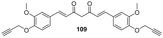 Chen et al. investigated 54 (Figure 8), also known as C66 curcuminoid, for its antiproliferative potential towards pancreatic cancer cells. In the study, the authors confirmed, by knocking down corresponding genes, that c-Jun N-terminal kinase plays an important role in the proliferation of pancreatic cancer cell lines. Moreover, the expression of the kinase was related to enhanced activity of pro-inflammatory factors. The inhibition of the kinase phosphorylation by 54 was confirmed in the study and further in vitro antiproliferative, anti-migration, and antimetastatic properties of the compound were evaluated. The IC50 levels of its activity on Panc-1 and SW1990 were 113.4 and 91.83 μM, respectively [60].