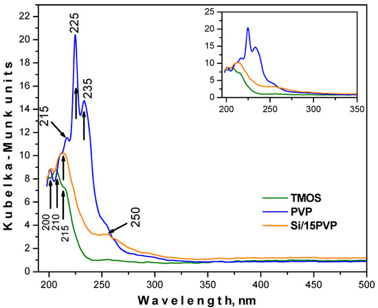 UV–Vis spectra for the pure TMOS, PVP, and SiO2/15PVP hybrid. The inset shows the spectra in the range of 200–350 nm.
