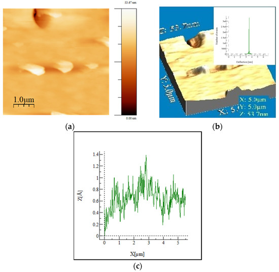 The AFM images in Figure 4 show the morphology of the micro- and nanostructured surface of the hybrid SiO2/15PVP material. The scanned area has dimensions of 5 × 5 μm2 and a scanning speed of 10 kH. From Figure 4a, it can be seen that the sample has a relatively smooth surface with negligible irregularities but significant homogeneity. Figure 4b is a three-dimensional topographic map from which the main parameters of the AFM analysis are determined. The inset in Figure 4b exhibits the hysteresis of the height distribution profiles of surfaces from which the mean square roughness (RMS) is determined. It represents the standard deviation of the height value in the selected region, which is 0.089 nm, and the calculated Ra (roughness average) for the scanned area is 0.055 nm. The surface height distribution profile (Figure 4c) obtained from the 3D image shows that the surface morphology of the inorganic–organic hybrid SiO2/15PVP material is homogeneous and structured by minor irregularities with relatively low height. Other AFM studies of sol–gel hybrid materials show a good homogeneous continuous structure, as well as certain aspects of the morphology of the surface depending on the chemical composition and percentage of the organic additive [22,23].