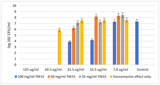 Figure 5 shows the amount (in CFU/mL) of Staphylococcus epidermidis ATCC 14990 at different concentrations of SiO2/15PVP (100 mg/mL, 50 mg/mL, and 25 mg/mL) in combination with the antibiotic Vancomycin and compared to the effect of the antibiotic alone. The MBC of the single action of the antibiotic Vancomycin against Staphylococcus epidermidis was determined—125 µg/mL, while in the combination of Vancomycin with the highest concentration of SiO2/15PVP (100 mg/mL), the MBC already decreased to only 62.5 µg/mL for the antibiotic concentration. The results in Figure 5 show that the minimum inhibition concentration (MIC) of single Vancomycin is 62.5 µg/mL, and the minimum inhibition concentration of 100 mg/mL SiO2/15PVP in combination with Vancomycin is 31.5 µg/mL.