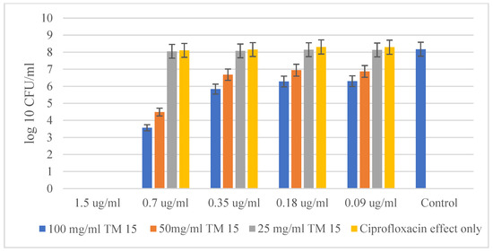 The experiments with the Gram-negative bacteria Salmonella typhimurium ATCC BAA-2162 and the antibiotic Ciprofloxacin showed similar results in the resistance of the bacteria against the antibiotic alone and in the combination of Ciprofloxacin with the highest concentration of the hybrid. The obtained results for Salmonella typhimurium are quite similar to those obtained for Staphylococcus epidermidis (Figure 6). The chart does not show a big difference in MBC between the independent action of the antibiotic and when it is combined with the highest concentration of the hybrid material SiO2/15PVP (100 mg/mL). The MBC of the antibiotic acting alone against Salmonella typhimurium ATCC BAA-2162 was found to be 1.5 µg/mL, which is the same value as the effect of Ciprofloxacin in combination with SiO2/15PVP. Interestingly, the data from the graph confirm the significant synergistic effect of the antibiotic in combination with SiO2/15PVP, especially at their highest concentration of 100 mg/mL. As the minimum inhibitory concentration (MIC) of Ciprofloxacin in combination with the hybrid nanomaterials was 0.7 µg/mL, it is significantly lower than that of the antibiotic acting alone. The difference in the microbial quantity of the antibiotic alone and the combination of antimicrobial agents is almost four times more.