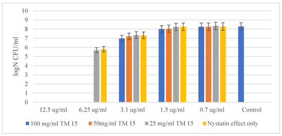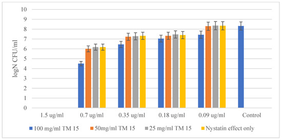 The other yeast tested showed quite similar results in its suppression by Nystatin and the hybrid material. However, Saccharomyces cerevisiae CCY 21-6-3 turned out to be a much more sensitive microorganism. Figure 8 shows a similar MBC of Nystatin acting alone and in combination with 100 mg/mL of the hybrid material. The MBC of Nystatin against Saccharomyces cerevisiae was established to be 1.5 µg/mL, while for the combination of Nystatin and the highest concentration (100 mg/mL) of SiO2/15PVP, the MIC was established to be 0.7 µg/mL. Microbial growth was inhibited by almost 10,000 times.