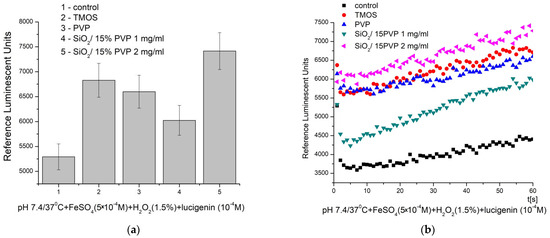 At pH 7.4/37 °C (physiological), the kinetic curves showed a gradual increase in the signal over time, indicating the generation of ROS in both the control and test reactions. The control reaction had the lowest signal, with a maximum of around 5300 RLU. In all other cases, the recorded signal was higher than the control, indicating the stimulated generation of ·OH and ·OOH radicals for the newly synthesized material and its precursors. The observed effects were as follows: TMOS—29%, PVP—25%, SiO2/15PVP (1 mg/mL)—14%, and SiO2/15PVP (2 mg/mL)—40%. These results demonstrate a significant, nearly threefold increase in the effect of the newly synthesized material at low, borderline application concentrations—2 in comparison to 1 mg/mL. The newly synthesized SiO2/15PVP compound showed a significant pro-oxidant effect that persists over time. In comparison, our earlier results, described in [8], showed a similar prooxidant effect for the SiO2/20PVP material in the same reaction and conditions at a significantly higher final concentration (25 mg/mL). The differences in the control reaction signal are due to the extreme sensitivity of the method, which is why controls are prepared for each evaluation.