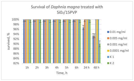 Daphnia are extremely sensitive organisms in the aquatic environment, which allows conclusions to be drawn from the obtained results about the influence of SiO2/15PVP on other aquatic organisms as well. Behavioral results of Daphnia showed 100% survival in the acute toxicity test at 0.001 and 0.0001 mg/mL concentration. At the highest concentration (0.01 mg/mL) at 24 h and 48 h, 97% of Daphnia survived. At the second concentration (0.005 mg/mL) up to the twenty-fourth day, survival was 100%, and at 48 h, 97% survival of Daphnia was observed. Compared to studies performed on the effect of PVP 20% on D. magna [7], the present results showed that PVP 15% was even better tolerated by Daphnia, close to 100%. Therefore, these concentrations of the substance used (PVP 15%) can be considered harmless and can be discharged for whatever reason into surface waters without harm to organisms (Figure 10).