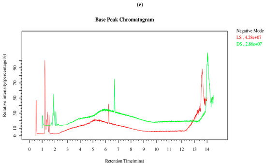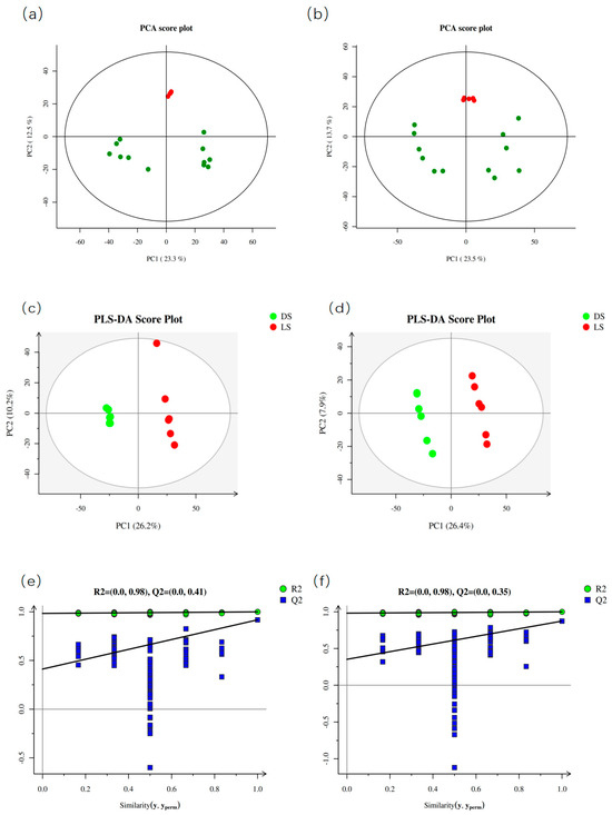 PLS-DA was performed on the metabolite accumulation levels to model the relationships that differentiated the sample groups. The PLS-DA model scores revealed that the DS and LS groups were different, which was consistent with the PCA results. The PLS-DA model had R2X values of 36.4% (+) and 34.2% (−), R2Y values of 99.9% (+) and 99.9% (−), and Q2 values of 91.7% (+) and 87.3% (−). This shows that the model has good predictive ability. To check whether the PLS-DA model is overfitted or not, 7-fold cross-validation and 200 response alignment tests were conducted to check the quality of the model, and the results proved that the model built is consistent with the real situation of the sample data and that the model is not overfitted (Figure 1e,f).