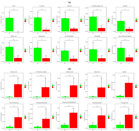 According to the screening criteria of VIP value > 1 and p-value < 0.05 in a t-test, metabolite screening was carried out. Eventually, 810 differentially expressed metabolites were obtained in positive ion mode (426 upregulated and 384 downregulated), and 861 differentially expressed metabolites were obtained in negative ion mode (183 upregulated and 678 downregulated). To screen for metabolites that change significantly under different physiological states or environmental conditions and to identify key metabolites associated with specific biological processes and environmental factors, fragment information obtained using MS/MS mode was further matched and annotated via standard databases such as the Human Metabolome Database (HMDB), Metlin, MassBank, LipidMaps, and mzCloud. Accurate information on metabolites was obtained, resulting in the identification of 232 secondary metabolites in total, of which 66 were differentially expressed (24 upregulated, 42 downregulated). The differentially abundant metabolites included mainly amino acids and their derivatives, nucleic acids, alcohols, organic acids, amines, fatty acids, purines, and sugars (Figure 2c). The fold differences in various metabolites between LS and DS were compared, with Figure 2a,b showing the top 20 differentially expressed metabolic components in terms of fold change. Compared with LS, compounds such as uracil, L-cysteine, benzoate, L-2-hydroxyglutaric acid, creatinine, phthalic acid, hydroquinone, (S)-1-phenylethanol, theophylline, threo-3-hydroxy-D-aspartate, oxoadipic acid, chlorohydroquinone, N2-gamma-glutamylglutamine, O-phosphoethanolamine, uracil 5-carboxylate, quinate, glutamic acid, L-glutamic acid, cis-4-hydroxy-L-proline, and gluconic acid were significantly different in DS. This finding is in line with numerous studies, where the rhizosphere soil metabolites predominantly consist of amino acids, saccharides, organic acids, and lipids. Li et al. found that with the extension of continuous cropping years, the relative abundances of lipid compounds, organic acids, and phenolic substances decreased, while the relative abundance of carbohydrates increased [38]. Yang et al. identified a variety of differential metabolites from the rhizosphere soil of Codonopsis pilosula in different continuous cropping years, including lipids, acids, sugars, other substances, esters, phenols, and amines [39]. This indicates that under different soil conditions, the metabolite species are comparable, yet their abundances vary [50,51].