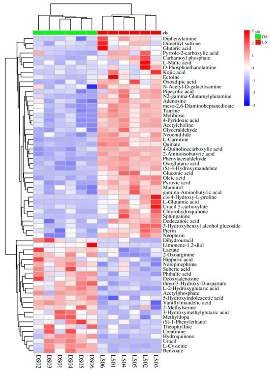 Hierarchical clustering analysis using Euclidean distance as the measure of dissimilarity was employed to visually present the differences in metabolite content in Codonopsis pilosula soil under different stubble conditions in the form of heatmaps. In the clustering analysis heatmap, each row represents the same differentially abundant metabolite, and each column represents the same Codonopsis pilosula sample. Different colors indicate different levels of metabolite content, with red representing high content and blue representing low content. Clustering analysis was performed on differentially abundant metabolites in Codonopsis pilosula soil under different crop rotations, and the results are represented in the form of heatmaps. Significant color distributions were observed, indicating distinct regions of high and low content expression in Codonopsis pilosula samples under different crop rotations. Comprehensive clustering analysis of Codonopsis pilosula samples (LS and DS) under different crop rotations identified a total of 66 differentially abundant metabolites, as shown in Figure 3. The heatmap shows the distribution of these differentially abundant metabolite contents in the two Codonopsis pilosula samples. The contents of metabolites such as benzoate, L-cysteine, creatinine, (S)-1-phenylethanol, and 2-methylserine were significantly greater in the DS samples than in the LS samples. However, the contents of metabolites such as quinate, glutamic acid, chlorohydroquinone, 4-quinoline carboxylic acid, and diphenylamine were significantly lower than those in the LS samples. The distribution of high-content (red) and low-content metabolites was clearly observed, with high-content metabolites (red) predominantly located at the bottom.