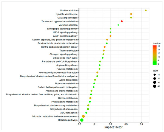 Dimensionality reduction analysis of sample data was performed via PCA, PLS-DA, and OPLS-DA with the Roplal package in R. After data scaling, score plots, loading plots, and S-plots were generated to illustrate differences in metabolite composition among samples. Overfitting of the model was tested via permutation tests; R2X and R2Y represent the explained variance for the X and Y matrices, respectively, whereas Q2 reflects the predictive ability of the model. The closer these values are to 1, the better the model fit, and the more accurately the training set samples can be classified into their original groups. p-values were calculated via statistical tests, whereas VIP and FC values were computed via OPLS-DA to measure the impact and explanatory power of metabolite content on sample classification, aiding in the selection of marker metabolites. Metabolites are considered statistically significant when the p-value is <0.05 and the VIP > 1. Pearson correlation coefficients or Spearman rank correlation coefficients between all pairs of metabolites were calculated to analyze correlations, and a heatmap of differentially abundant metabolite associations was generated. Functional pathway enrichment and topological analysis of the selected differentially abundant metabolites were performed via the MetaboAnalystl10 software package (www.metaboanalyst.ca). The enriched pathways were visualized via the KEGG Mapper tool to browse the differentially abundant metabolites within the pathway maps.