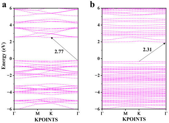 The energy band structures and density of states of CN and KBCN were calculated via the HSE06 method and are shown in Figure 3, Figure 4 and Figure S2. It is worth noting that the band gap of CN (2.77 eV) calculated using the HSE06 function is similar to the experimental data (2.79 eV) [47]. The band gap of KBCN (2.31 eV) is reduced by co-doped K and B atoms compared to CN, as shown in Figure 3. Additionally, the band gap of KBCN shows also improvement over singly B-doped CN (2.63 eV) [34], and K-doped CN (2.72 eV) [47].