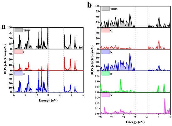 A further analysis of the density of states for CN shows that VB is dominated by N atoms and is contributed by N2px and N2py orbitals in N. CB is mainly contributed by C2pz orbitals in C atoms, with a small amount of CB being from N atoms as shown in Figure 4a and Figure S2a,b. For KBCN, VB is composed of N and B atoms, and CB is composed of C and N atoms, as depicted in Figure 4b and Figure S2e,f. Observing the DOS of KBCN, the electronic push–pull of the B, C, and N elements drives the conduction band downward shift resulting in a reduced band gap. This broadens the range of visible light utilisation and, thus, improves the CO2 reduction process.