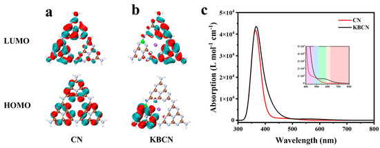 LUMO and HOMO of (a) CN and (b) KBCN. Atomic color codes B, C, N, K are represented by green, brown, silver, and purple, respectively. (c) Optical absorption behaviors of CN and KBCN.