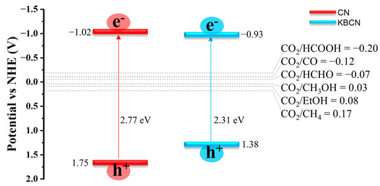 Semiconductor materials used as photocatalysts for CO2 reduction need to have suitable band edge positions to match the CO2/hydrocarbon potentials. The VB and CB extreme (VBM and CBM) edge positions of CN and KBCN were calculated relative to the normal hydrogen electrode potential using Equations (4)–(7) in Section 3. As shown in Figure 7, the CBM of CN and KBCN is −1.02 and −0.93 V, respectively, values which are higher than the potential for CO2 reduction to various substances such as CO, HCOOH, HCHO, CH3OH, CH4, and EtOH. Meanwhile, the VBM of CN and KBCN is 1.75 and 1.38 V, values which are lower than the reduction potentials of CO2. Therefore, CN and KBCN can be used as potential photocatalysts for the reduction in CO2 to various hydrocarbons. Although the CBM of KBCN is slightly lower than that of CN, its potential is still higher than the reduction potential of CO2. It also has an enhanced range of visible light utilisation due to the reduced band gap. KBCN is, therefore, more suitable than CN for CO2 reduction because of its smaller band gap value, which is 2.77 eV for CN and only 2.31 eV for KBCN.