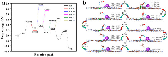 Wang et al. synthesised KBCN experimentally [25], and this study explores the advantages of KBCN for photocatalytic CO2 reduction from a theoretical perspective. The complete eight-electron process of the reduction in CO2 by KBCN is considered. Figure 9a,b and Figures S3b and S4b show the Gibbs free energy changes and the geometric and electronic structure changes in the reduction process. The calculations show that Path II, Path III, Path IV, Path V, and Path VI are the secondary reaction paths. Path II undergoes a two-electron reduction step to reduce CO2 to HCOOH with ∆G = 0.415 eV. It is, therefore, a heat-absorbing reaction and a thermodynamically non-spontaneous process. The intermediates undergoing Path III, Path IV, Path V, and Path VI are *COH, *CHOH, *CH2OH, and *O, respectively, corresponding to Gibbs free energies of 2.761, 2.315, 1.242, and 1.460 eV. However, the ∆G of Path I is lower than that of Path III–VI for the same electron reduction steps, where the ∆G of *OCH, HCHO, *OCH3, and CH3OH steps are 0.850, 0.382, 0.552, and −0.178 eV, respectively. Therefore, the CO2 reduction process mainly follows Path I. The CO2 is first adsorbed onto the KBCN in the physisorbed state, where the O atoms in the CO2 are mainly attracted to the B and K atoms in the catalyst. After step ①, the physisorbed CO2 changes to chemisorption, where the O and C in the CO2 are captured by the B and N in the KBCN, a process that absorbs 0.3 eV of energy. This is followed by step ②, which absorbs 0.861 eV of energy to produce *COOH, the decisive step in the reduction in CO2 by KBCN. In step ③, *COOH continues to couple h+/e− to obtain CO + H2O, which releases 0.574 eV of energy and is a thermodynamically spontaneous process. The coupling of h+/e− then diversifies, with coupling to the O atom of the catalyst giving *COH (Path III) and coupling to the C atom giving *OCH. The optimal path forms *OCH (step ④), absorbing 0.263 eV energy. In step ⑤, h+/e− is still coupled to the energetically advantageous C site rather than the O site and undergoes a four-electron reduction process to give HCHO, which releases 0.468 eV of energy. Step ⑥ is similar to the previous step, with h+/e− coupling at the C site to give *OCH3 and absorb 0.17 eV of energy. The stabilisation point of this process is different from that of CN because the hydroxyl H in *CH2OH in KBCN is further away from the catalyst, weakening the hydrogen bonding interaction. In addition, the O atom in KBCN interacts more strongly with the B atom, resulting in a lower energy of *OCH3. In step ⑦, h+/e− combines with oxygen atoms to form CH3OH products rather than C atoms to form *O + CH4. This process releases 0.730 eV of energy and produces a thermodynamically stable CH3OH, ∆G = −0.178 eV. To investigate the complete eight-electron reduction in CO2, CH3OH continues to couple with h+/e− in step ⑧ to give *CH3, which absorbs 0.522 eV of energy and is thermodynamically non-spontaneous. Finally, *CH3 is reduced to CH4 (step ⑨) by h+/e− while releasing 1.462 eV of energy. Although ∆G = −1.118 eV for CH4, the KBCN is also eventually reduced to CH3OH because step ⑧ is a heat-absorbing process. The calculations show that for KBCN, h+/e− prefers to couple with the C atom. The thermodynamic curves show that the formations of *COOH, *OCH, *OCH3, and *CH3 intermediates are heat-absorbing processes, whereas the formations of CO, HCHO, CH3OH, and CH4 products are exergonic processes.