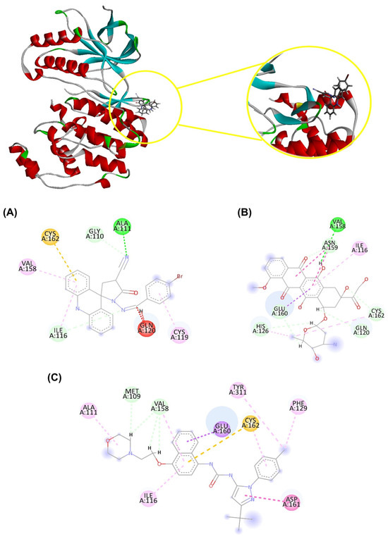 2D and 3D interactions between (A) AMTAC-19, (B) doxorubicin (DXR), (C) PDB Ligand (pyridine carbamate inhibitor), and ERK1 (PDB: 5LCJ). Legend: pink and blue: hydrophobic interactions; red: steric interactions; green: hydrogen bond interactions; CYS: cysteine; GLY: glycine; VAL: valine; LEU: leucine; ALA: alanine; ASP: aspartic acid; ILE: isoleucine; THR: threonine; GLU: glutamic acid; MET: methionine; and GLN: glutamine.