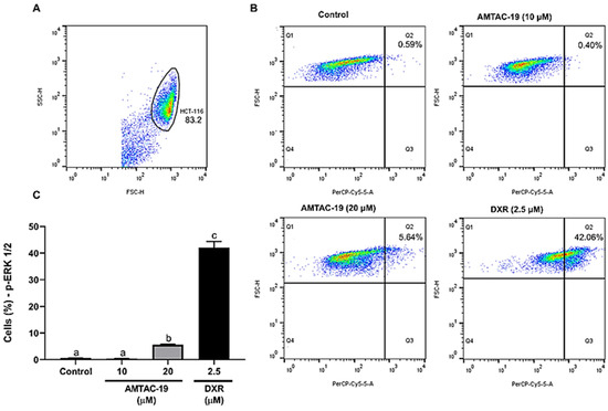 Effect of AMTAC-19 (10 or 20 µM) or doxorubicin (DXR, 2.5 µM) treatments on phospho-Extracellular Signal-Regulated Kinase 1 and 2 (p-ERK1/2) activity in HCT-116 cells. (A) The cell population was assessed by analyzing the p-ERK1/2 fluorescence dotplots (PerCP-Cy5.5), determining the region (Q1) corresponding to the autofluorescence of unlabeled cells and the region (Q2) corresponding to the percentage of fluorescent cells considered positive. (B) Representative dotplots show p-ERK1/2 fluorescence (PerCP-Cy5.5, X-axis) as a function of cell size (FSC–Forward Scatter, Y-axis) for different experimental groups. (C) The results obtained by flow cytometry are graphically presented. The data are represented as mean ± standard error of the mean (SEM) in triplicate. ANOVA followed by Tukey’s test. Different letters (a, b, c) indicate significant differences between groups (p < 0.05).