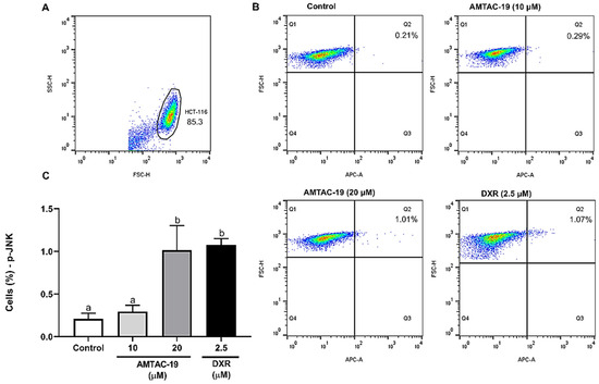 Effect of AMTAC-19 (10 or 20 µM) or doxorubicin (DXR, 2.5 µM) treatments on phospho-c-Jun N-terminal Kinase (p-JNK) activity in HCT-116 cells. (A) The cell population was assessed by analyzing p-JNK fluorescence dotplots (APC), determining the region (Q1) corresponding to the autofluorescence of unlabeled cells and the region (Q2) corresponding to the percentage of fluorescent cells considered positive. (B) Representative dotplots show p-JNK fluorescence (APC, X-axis) as a function of cell size (FSC–Forward Scatter, Y-axis) for different experimental groups. (C) The results obtained by flow cytometry are graphically presented. The data are represented as mean ± standard error of the mean (SEM) in triplicate. ANOVA followed by Tukey’s test. Different letters (a, b) indicate significant differences between groups (p < 0.05).