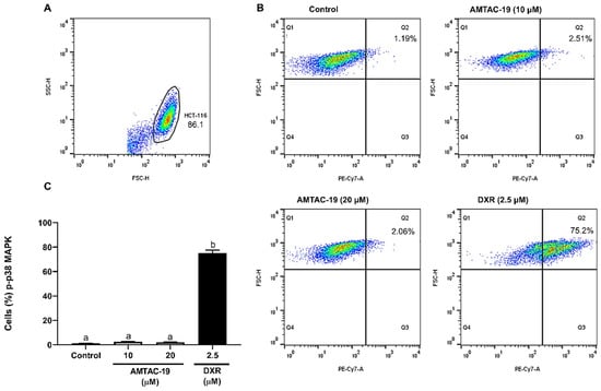 Effect of AMTAC-19 (10 or 20 µM) or doxorubicin (DXR, 2.5 µM) treatments on phospho-p38 Mitogen-Activated Protein Kinase (p-p38 MAPK) activity in HCT-116 cells. (A) The cell population was assessed by analyzing p-p38 MAPK fluorescence dotplots (PE-Cy7), determining the region (Q1) corresponding to the autofluorescence of unlabeled cells and the region (Q2) corresponding to the percentage of fluorescent cells considered positive. (B) Representative dotplots show p-p38 MAPK fluorescence (PE-Cy7, X-axis) as a function of cell size (FSC–Forward Scatter, Y-axis) for different experimental groups. (C) The results obtained by flow cytometry are graphically presented. The data are represented as mean ± standard error of the mean (SEM) in triplicate. ANOVA followed by Tukey’s test. Different letters (a, b) indicate significant differences between groups (p < 0.05).