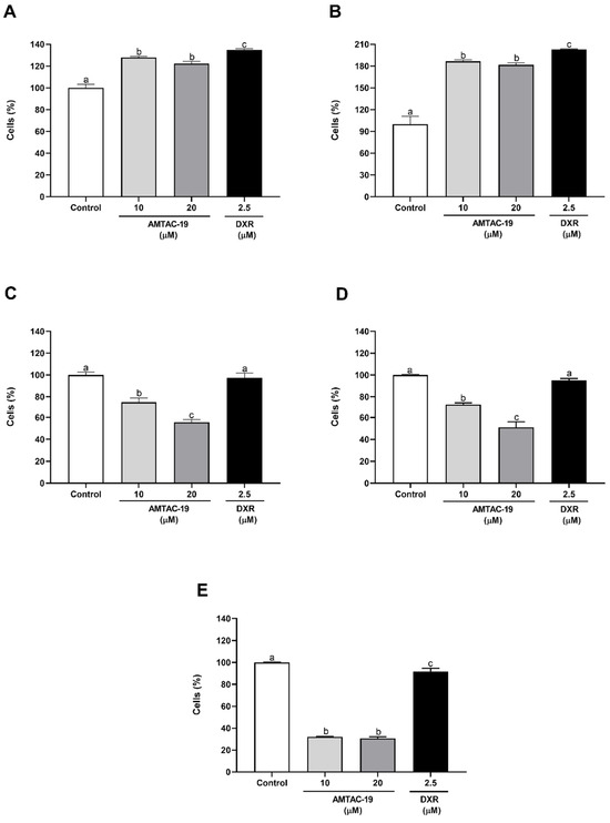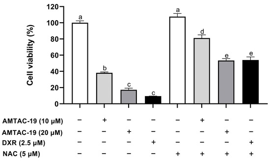 The MTT assay was used to evaluate cell viability after treatment with AMTAC-19 (10 or 20 µM) or doxorubicin (DXR) (2.5 µM) in the presence or absence of N-acetylcysteine (NAC, 5 µM) for 72 h. The results are presented as mean ± standard error of the mean (SEM) in triplicate. ANOVA followed by Tukey’s test. Different letters (a, b, c, d, e) indicate significant differences between groups (p < 0.05).