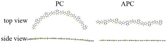 The ground-state minimum geometry of the monomer was optimized under the Cs point group symmetry constraint at the BHandHLYP/def2-SVP level of theory. Based on this planar geometry, we recalculated the geometry optimization at the BHandHLYP/def2-SVP level of theory without any symmetry constraint. The geometry obtained with C1 symmetry is almost identical to that of Cs symmetry. The optimization at the B3LYP/def2-SVP level gives almost the same ground-state geometry, implying a weak dependence of the ground-state geometry on the functional selection. For CPDTBTN (N = 2–6), i.e., dimer, trimer, tetramer, pentamer, and hexamer, the ground-state minimum geometries for two configurations (PC and APC) were all optimized at the BHandHLYP level. For the dimer and trimer, the def2-SVP basis set was used. For tetramer to hexamer, the SV basis set was used. Results indicate that the ground-state minimum geometries of CPDTBTN (N = 1–6) are all planar structures for both configurations (Figure 1). For long oligomers, such as hexamer, two configurations (PC and APC) are different from the top view. PC displays an arc structure, while APC displays a linear structure (Figure 1). As expected, the APC isomer is more stable, while the energy difference between the two configurations is not dramatic (~5 kcal). Because PC and APC isomers share many similarities in their excited-state properties, such as vertical energies, oscillator strengths, and electronic characters, we mainly focus on APC isomers in the following discussion. All details on PC isomers can be found in the Supplementary Materials.