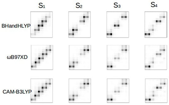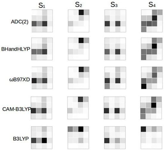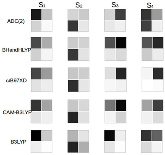The electronic character of the S1 and S2 states was further considered by examining the involved orbitals (Table 2) and the transition density analysis at the ADC(2) and TDDFT levels (Figure 2). In the transition density plots, the squares on the diagonal starting from the bottom left represent LE contributions, and the remaining squares represent CT states. The darker grey color represents a larger contribution to the excited state wave function. Further details of the transition density analysis used in this paper are described in the section “Computational Methods”. At the equilibrium geometry, three frontier orbitals (HOMO-1, HOMO, LUMO+1) are extended over the whole molecule. In contrast, the density of the LUMO is located mainly at the BT unit, although some delocalization is observed. For the transition density analysis, ADC(2) gives almost the same result as TDDFT with the B3LYP, BHandHLYP, CAM-B3LYP, and ωB97XD functionals. To describe the excitation, we use a nomenclature where D(X) and A (X) indicate that X is denoted as the donor and acceptor, respectively. The main contribution of the S1 excitation in the monomer is D(CPDT) → A(BT) CT excitation (~50%), while the other two LE [D(CPDT) → D(CPDT): 16% and A(BT) → A(BT): 27%] transitions also contribute to the wave function. The second excited state, S2, is mainly composed of both BT → BT LE excitations and CPDT → CPDT LE excitations (Figure 2).