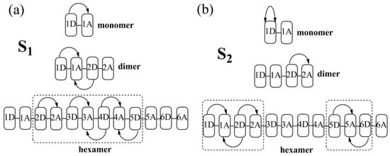 The main contributions of excitations for the two lowest excited states (a) S1 and (b) S2 in the monomer, dimer, and hexamer with APC.