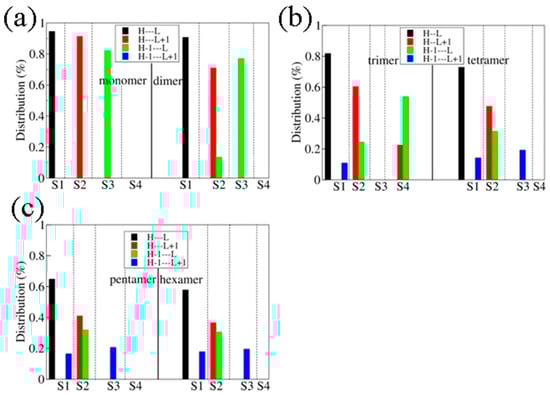 Distribution (%) of the four transitions (HOMO → LUMO, HOMO → LUMO+1, HOMO-1 → LUMO, and HOMO-1 → LUMO+1) on the excited states (S1, S2, S3, and S4) for the six oligomers of APC: (a) monomer and dimer; (b) trimer and tetramer; (c) pentamer and hexamer. H, L, H-1, and L+1 denote HOMO, LUMO, HOMO-1, and LUMO+1, respectively.