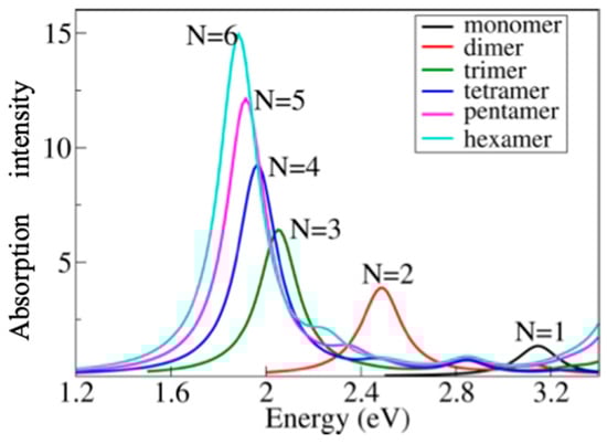 The simulated absorption spectra for the oligomer CPDTBTN (N = 1–6, APC) are given in Figure 7. From monomer to hexamer, the lowest S1 state is always responsible for the absorption spectra. The contributions of other excited states are rather minor. Similar behavior was also found in other linear conjugated systems that are treated as J aggregates [63]. In addition, an enhancement of the absorption intensity and a red shift of the peak position are observed with the larger polymerization degree. The absorption position of the monomer (3.1 eV) is far from that of the dimer (2.5 eV), while such a difference becomes lower between long oligomers.