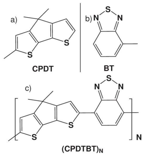 Poly-cyclopenta-dithiophene-benzothiadiazole is among such low-band gap copolymers with potential applications in organic bulk heterojunction solar cells [9,10,11,12]. Poly-CPDTBT consists of two units: an electron-rich (cyclopentadithiophene, CPDT) and an electron-poor (benzothiadiazole, BT) unit. The Poly-CPDTBT-family materials, introduced by Brabec [9] and co-workers in 2006, received great attention due to their very good performance. Great efforts were made to further improve the light-to-current conversion efficiency of organic solar cells based on Poly-CPDTBT-series materials [13,14,15,16,17,18,19,20]. For instance, many studies focused on the modification of electronic properties of polymers by introducing new functional groups or controlling device morphology by solvent additives [14,19,21,22,23].