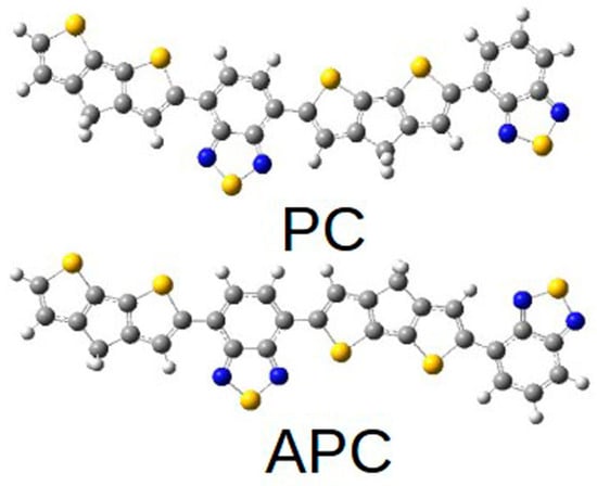 In addition, the orientation of two adjacent repeated moieties results in two configurations: parallel configuration (PC) and anti-parallel configuration (APC). For example, the dimer has two different configurations: PC and APC (Scheme 2). For all CPDTBTN (N = 2–6), we consider two isomers where the relative configurations of adjacent moieties are all PC or APC.