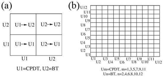 The classification of the electronic transitions for different oligomers. (a) Monomer: U1 and U2 denote the CPDT and BT units, respectively. U1 → U1 and U2 → U2 represent the local excitation at U1 and U2, respectively. U1 → U2 and U2 → U1 are the charge transfer excitations between U1 and U2. (b) Hexamer: each square shows the transition from the Ux (horizontal) to Uy (vertical) unit.